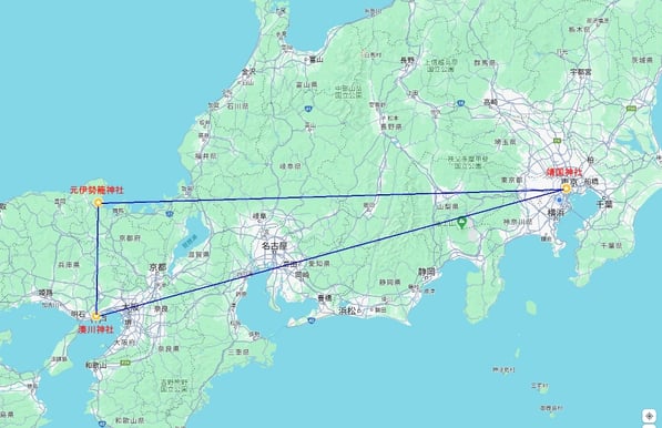 大和さざれ石は、全国の著名な神社に祀られています。その中でも特に有名なのが、伊勢神宮のふるさとである「元伊勢籠神社」、楠木正成公を祀る「湊川神社」、そして英霊を祀る「靖国神社」の三社です。特筆すべき点は、下の図に示されているように、これらの神社が三大都市圏にかかる結界(霊的バリア)としての役割も果たしていることです。自宅に「大和さざれ石」を祀ることで、距離に関係なく、この結界とつながることができます。