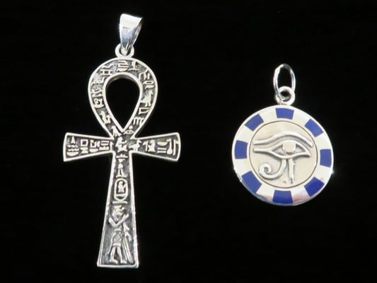 最近、海外のヒーラーが数多く訪れます。母国では当店のような店が存在しないため、口コミで広がっているようです。様々な商品をお買い上げになりますが、圧倒的に人気なのがピラミッドをはじめとするエジプト関連品です。今回はそんなニーズに応えてエジプトのアンクとホルスの眼のペンダントトップが入荷しました。
