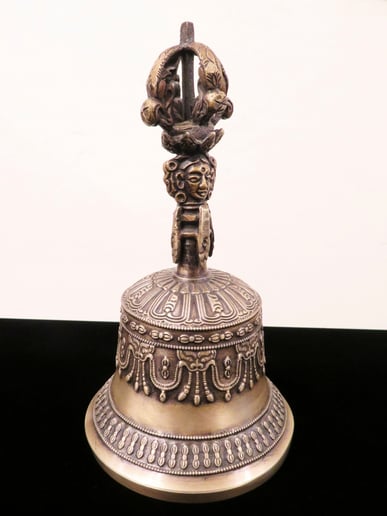 チベットより五鈷杵の一方に鈴がついた金剛鈴が入荷しました。五鈷鈴とも呼ばれています。打ち鳴らされた音波は仏や菩薩の波動と同調するため、聞くことで深い変性意識状態に導かれます。この音は聖なる宇宙音OM(オーム)と同じであるとされ、場の浄化や魔を祓う法具でもあります。一日一回鳴らすだけでも強力な邪気除け効果があります。